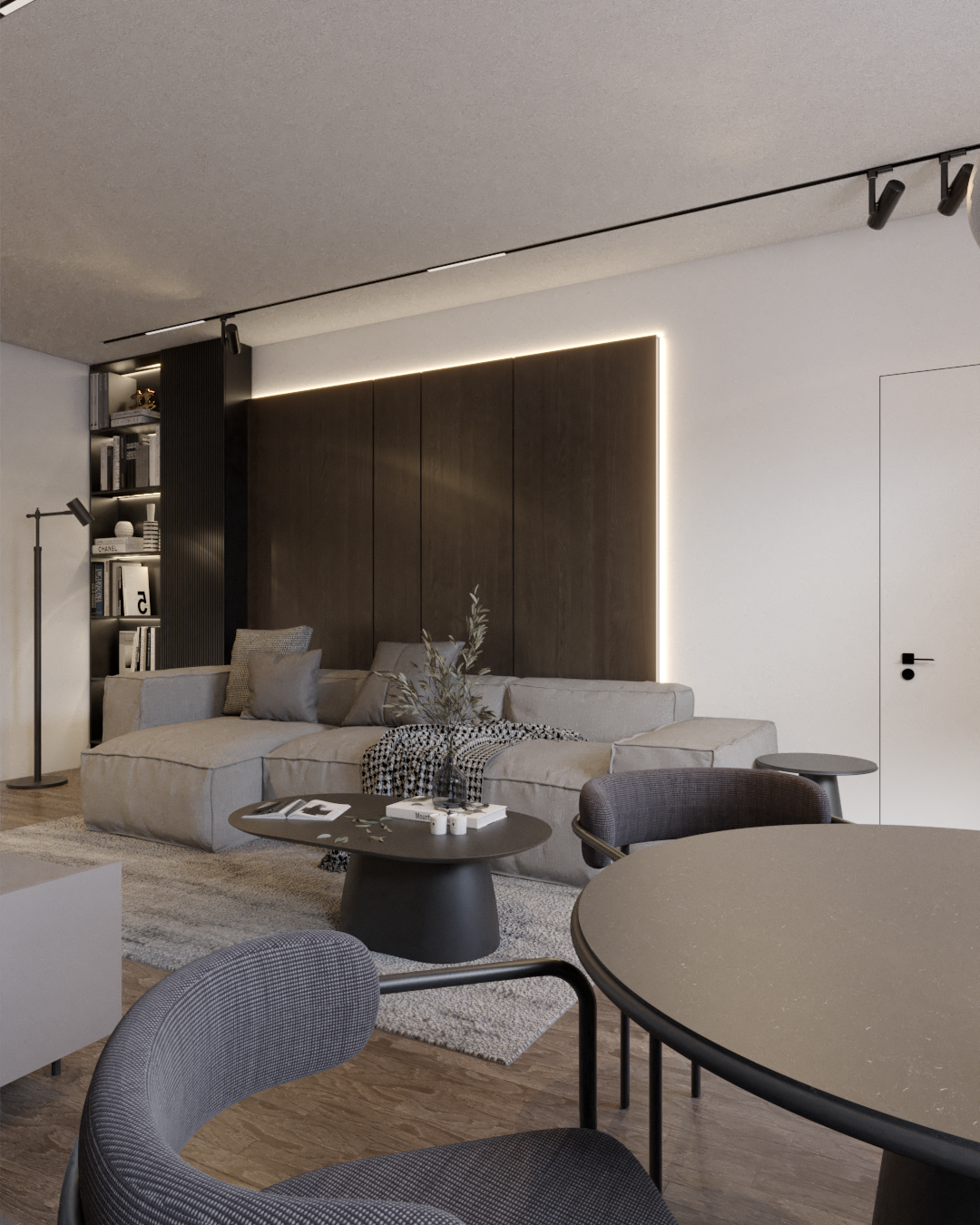 Strefa dzienna to klasyka nowoczesnego mieszkania — mamy tu otwartą kuchnię połączoną z salonem. Centralnie szary, wygodny narożnik, do którego aż chce się wskoczyć po pracy z kubkiem kawy. Obok regał na książki, który robi robotę i sprawia, że to wszystko nie jest tylko „ładne”, ale też naprawdę życiowe. Subtelne światło i naturalne materiały sprawiają, że całość daje poczucie ciepła i jest miejscem, gdzie można odpocząć albo zaprosić znajomych.
